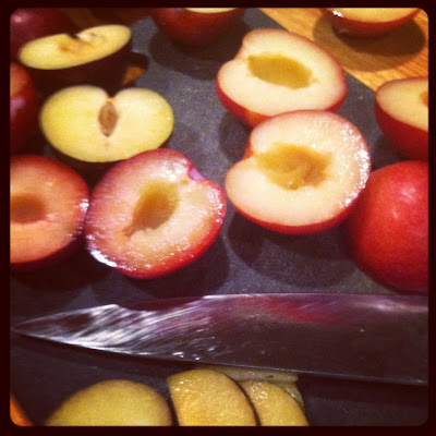 First of all you want to start by pitting your plums and slicing them. Just cut them in half and use a spoon or a small paring knife to cut out the pits then slice them thin.